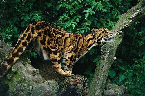 中文名:云豹 学名:Neofelisnebulosanebulosa 云豹为哺乳纲的猫科动物,有三个亚种。体长约70-110厘米,尾长约70-90厘米,体重约16-40千克,为豹亚科最小者。身体两侧有6个云状的暗色斑纹,故名。瞳孔长方形,收缩时纺锤形。犬齿锋利,与前臼齿之间的缝隙较大,长度比例在现存猫科动物中最大,能够咬杀较大猎物,此点与史前已灭绝的剑齿虎相似。 云豹分布于亚洲的东南部,从最西部的尼泊尔开始,一直向东到中国台湾,包括缅甸和中国秦岭以南;往南则从印度东部、中南半岛开始,一直向南到马来半岛等地为止。夜间活动,善爬树,常从树上跃下捕食猴、鸟、鼠、野兔、小鹿等小型哺乳动物,偶尔偷吃鸡、鸭等家禽。数量稀少,为中国国家一级保护动物。虽然它的名字有豹这个字,但它不属于豹属,而是独立的云豹属。